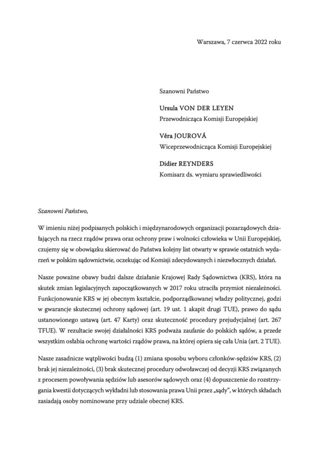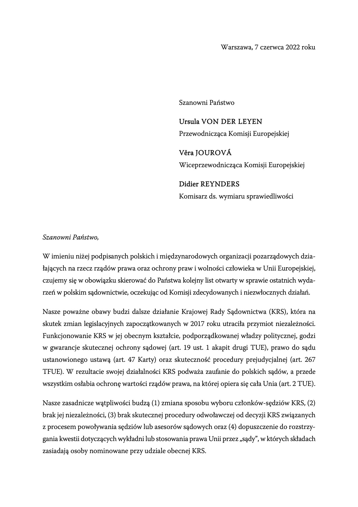 Polskie i międzynarodowe organizacje społeczne wystosowały list otwarty do przewodniczącej Komisji Europejskiej i komisarzy odpowiedzialnych za praworządność z wnioskiem o wszczęcie postępowania w sprawie uchybienia zobowiązaniom państwa członkowskiego w odniesieniu do Krajowej Rady Sądownictwa.